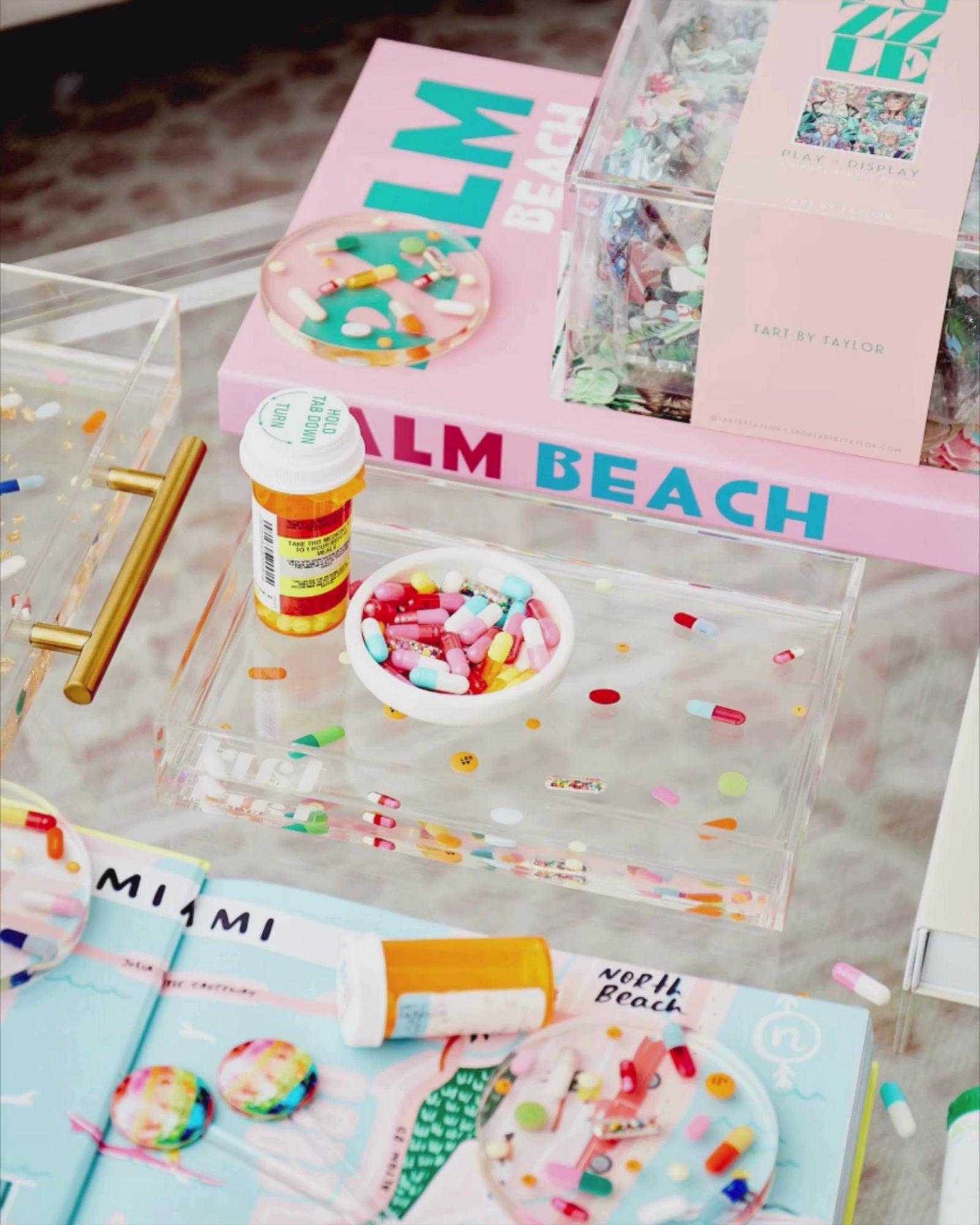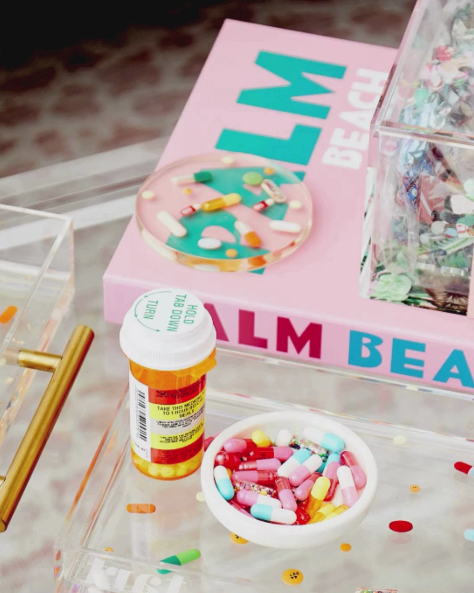 The uses for this tray are endless - perfect to keep on your bathroom sink or nightstand, on your coffee table or office desk, as a serving or charcuterie tray and the list goes on! Each tray is filled with various over the counter medications and hand-filled sprinkle/glitter capsules. Then covered in a thick layer of resin, making it totally waterproof and easy to clean.