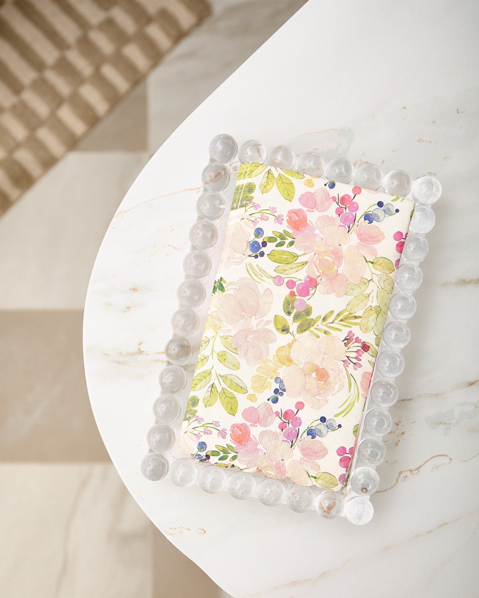 Add a touch of charm and function to your space with our Bubble Lucite Tray, designed to hold dinner napkins in style. The clear acrylic and playful bubble edging make it a perfect accent for bathrooms, powder rooms, or hosting setups. Beyond napkins, it’s just the right size to display a soap and lotion duo, your favorite perfumes, or other countertop essentials. Both practical and chic, this tray keeps everything organized while elevating any space.